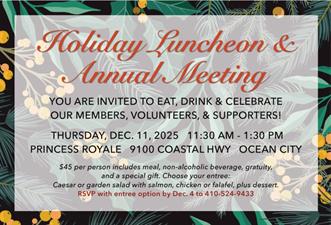Join the Art League of Ocean City for our annual Holiday Luncheon & Annual Meeting, a festive celebration honoring our members, volunteers, and supporters who make our creative community thrive!