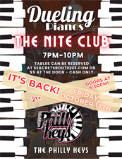 They’re back—and ready to rock the keys! Join us Friday, October 17th in The Nite Club for an unforgettable night with The Philly Keys! From classic sing-alongs to modern hits, these piano masters will have you laughing, dancing, and belting out your favorite tunes all night long.